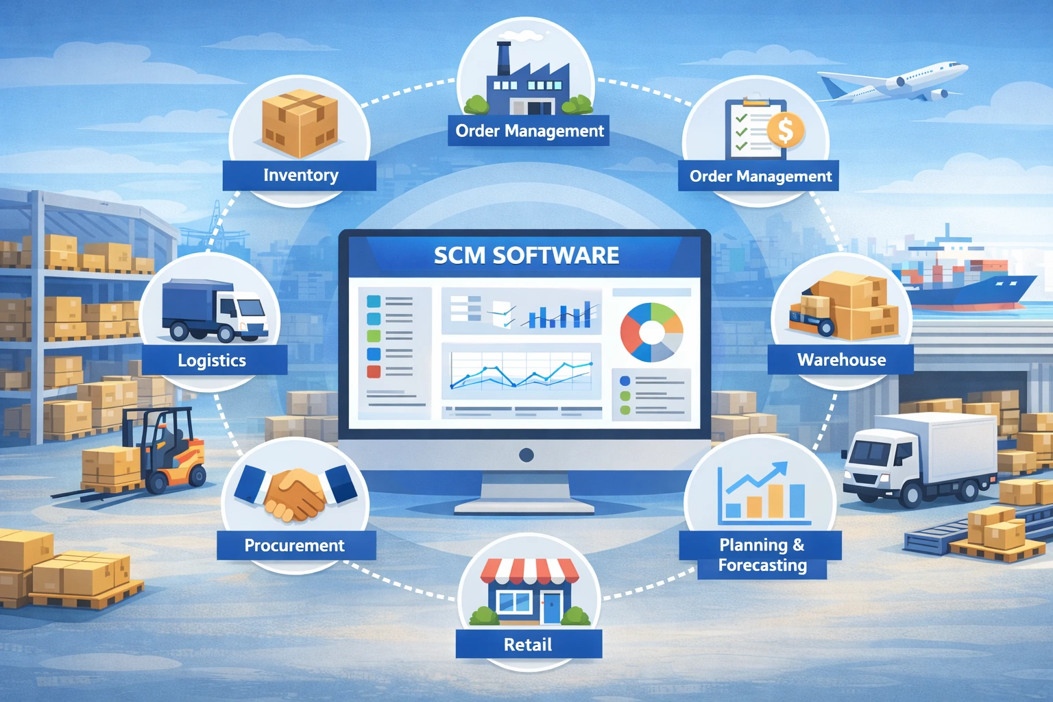 SCM software ecosystem connecting inventory management, logistics, procurement, retail, and order processing