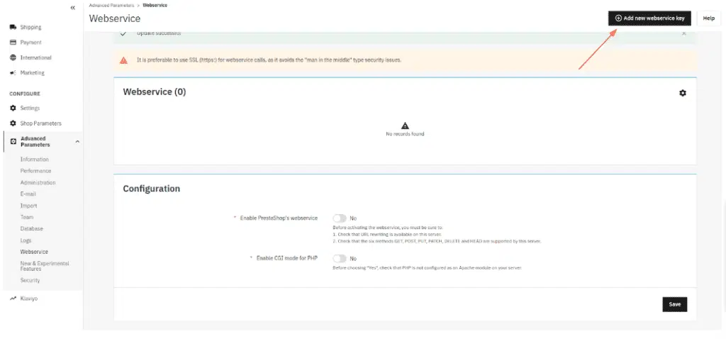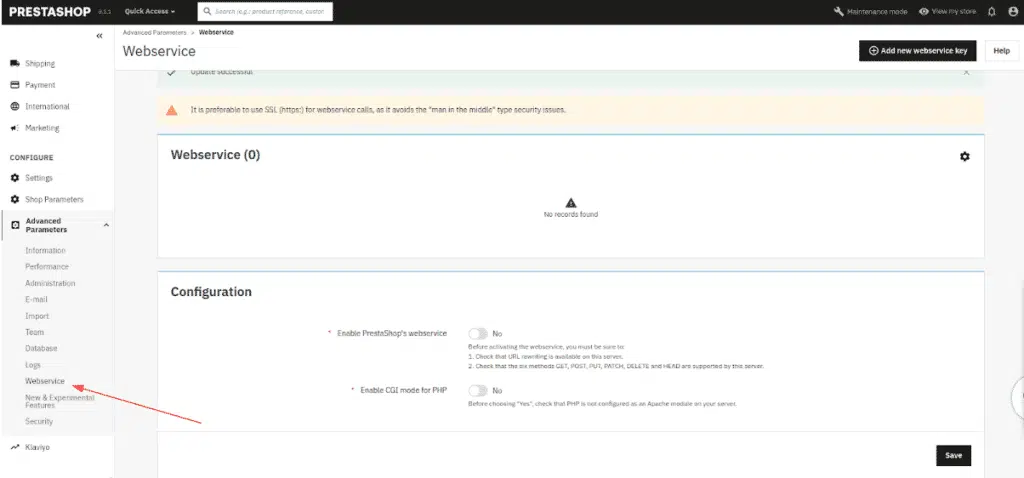 1. Visit PrestaShop. Go to the Advanced Parameters -> Webservice