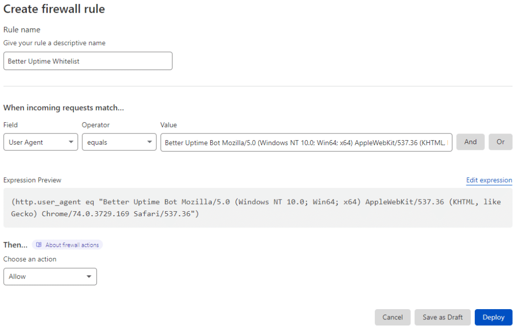 - Specify a rule name, set the Field to User Agent, Operator to Equals, and the Value to the "user_agent" parameter value, defined when adding the store to Api2Cart. Set Then... to Allow.