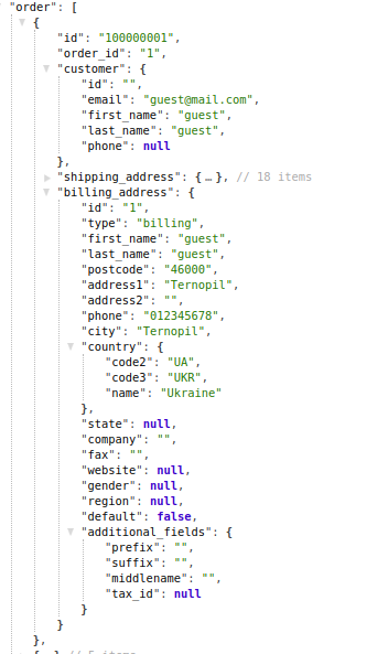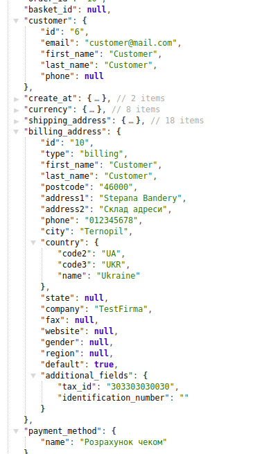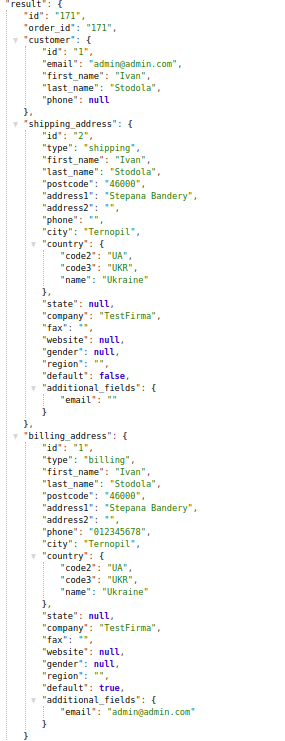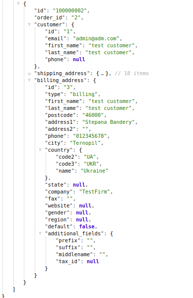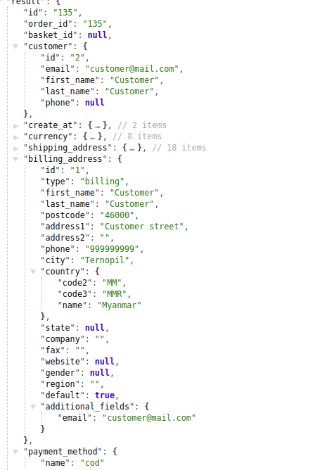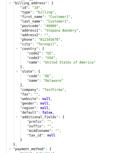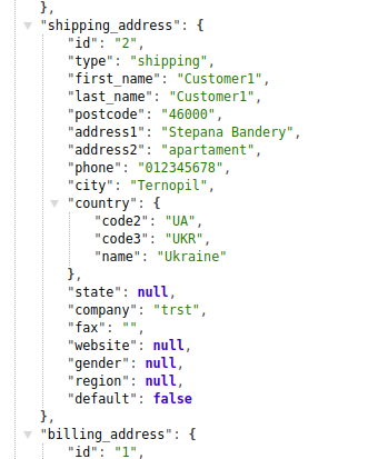 For a customer when placing an order the address filled in his personal account can be used or some other entered information. All the information on delivery and payment is displayed in the response from the app in the shipping_address and billing_address containers. Also, for the customer, his ID is displayed.