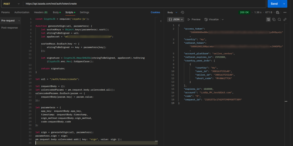 You can also generate an access token and refresh token not from API Testing Tool, but for example, using Postman. To do this, send a request to the endpoint https://api.lazada.com/rest/auth/token/create