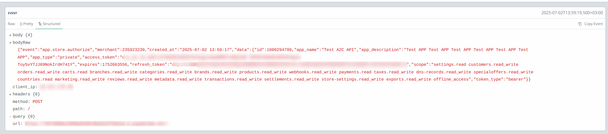 After the store owner confirms the app installation, you will receive a webhook containing the necessary credentials.
