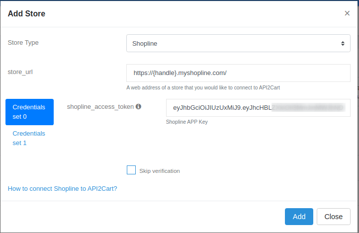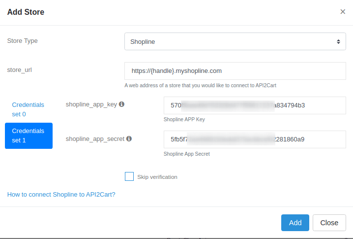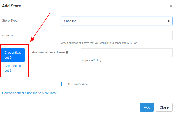 To connect Shopline to API2Cart, specify one of the available credential sets.