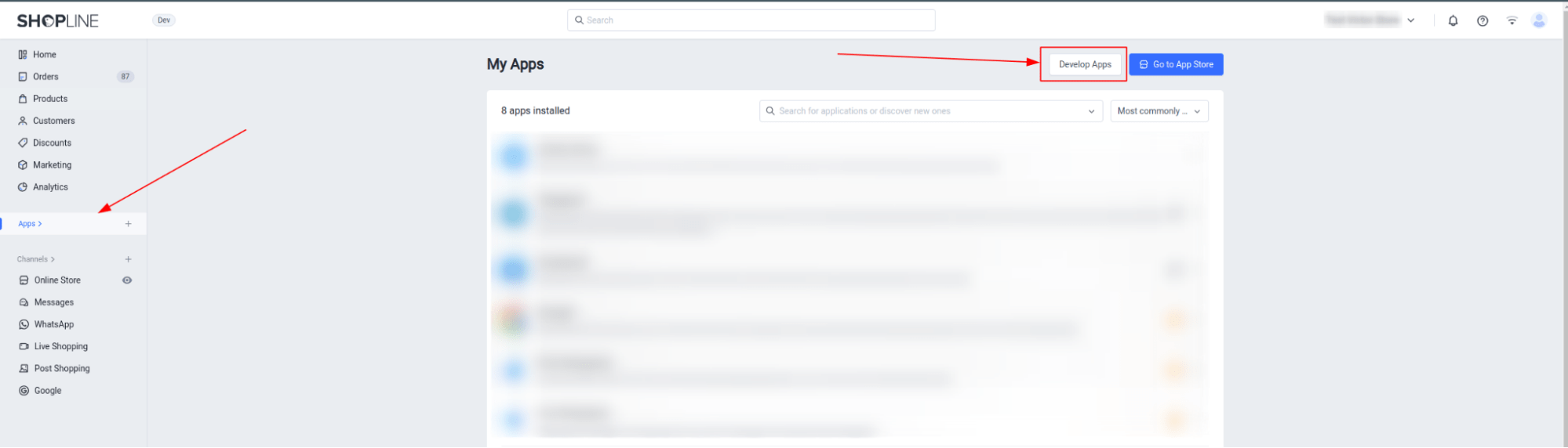 Firstly, you must go to the Apps section in the store's admin panel and click on 'Develop Apps'