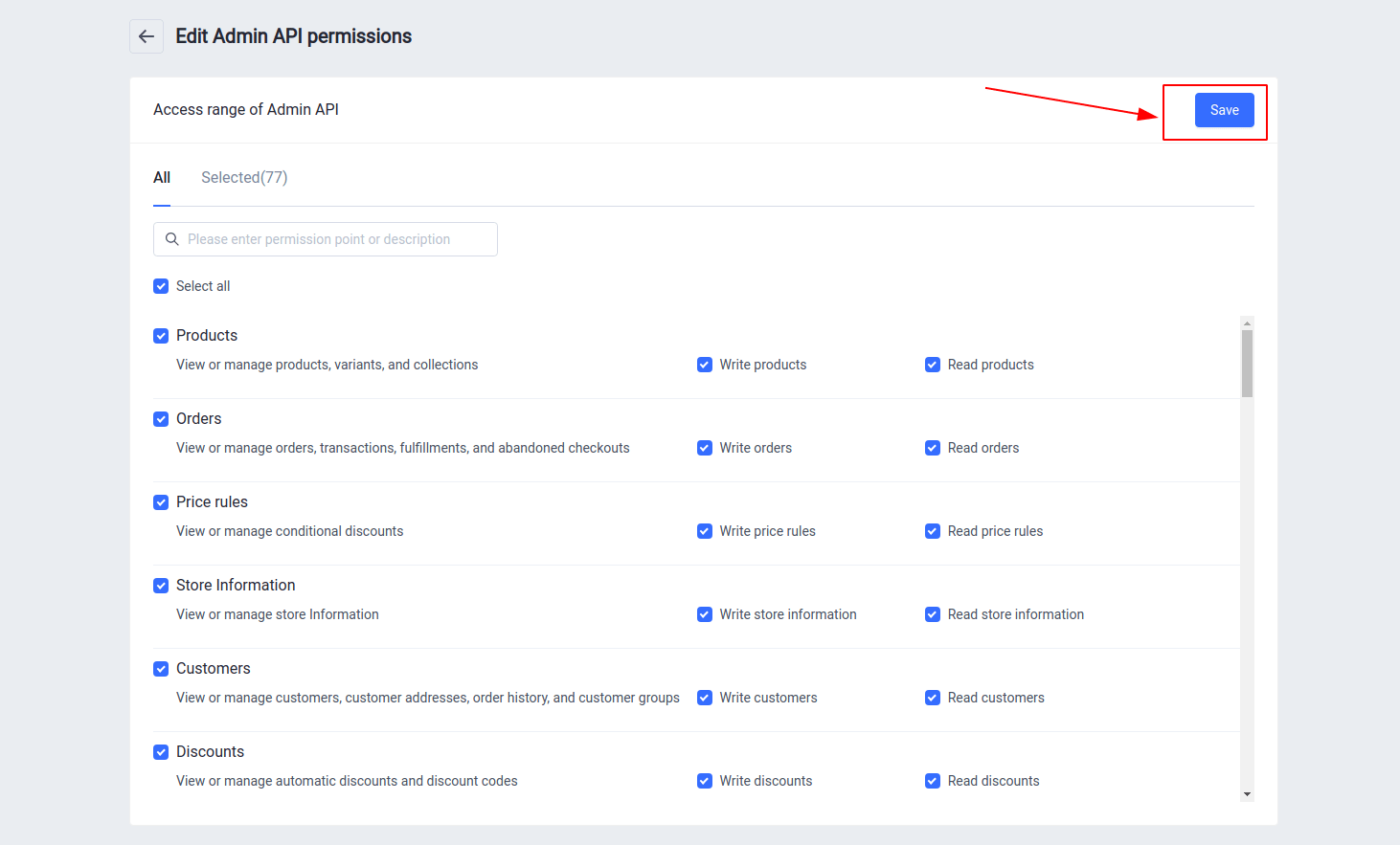 To add the store to the API, granting permissions for the relevant resources (read/write orders, products, customers, etc.) and specifying 'Read store information'.
