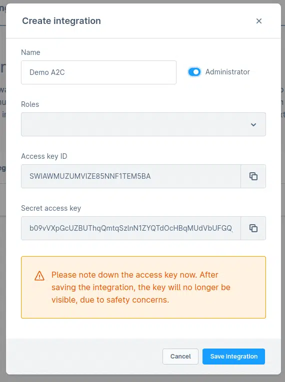 Use the obtained Access Key ID and Secret Access Key to connect Shopware API to Api2Cart, using them as parameters shopware_api_key and shopware_api_secret.